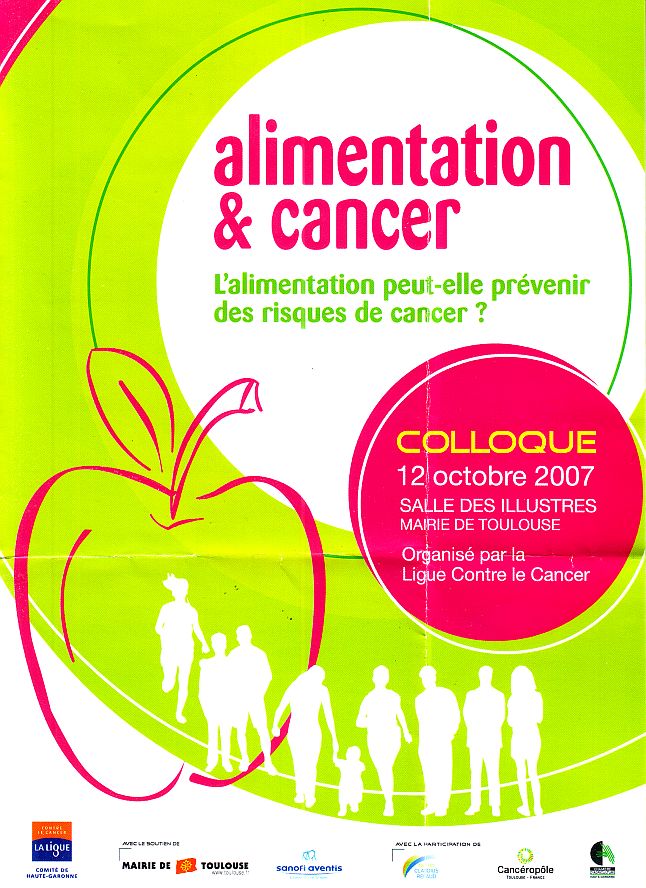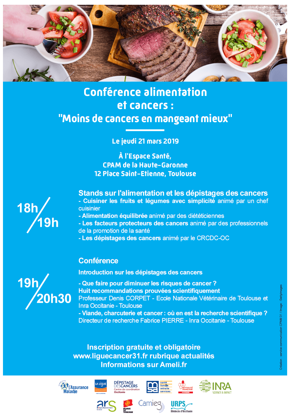 - 21 mars 2019 +Ligue contre le Cancer +CPAM, Toulouse, CPAM pl.St.Etienne: "Moins de cancers en mangeant mieux: Que faire pour diminuer les risques de cancer ? Huit recommandations prouvées scientifiquement"