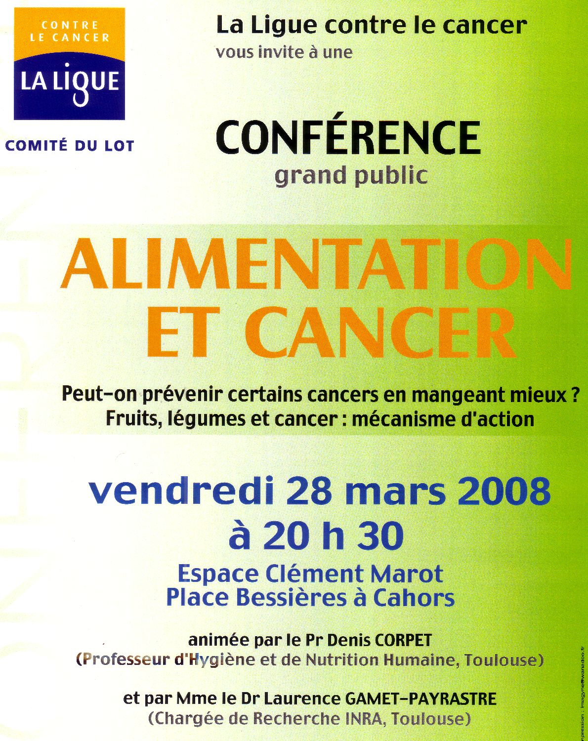 - 28 mars 2008, Alimentation & Cancer. Conférence Grand Public, Espace Clément Marot, Cahors. Ligue contre le Cancer, comité du Lot. 200 personnes, 2h30.