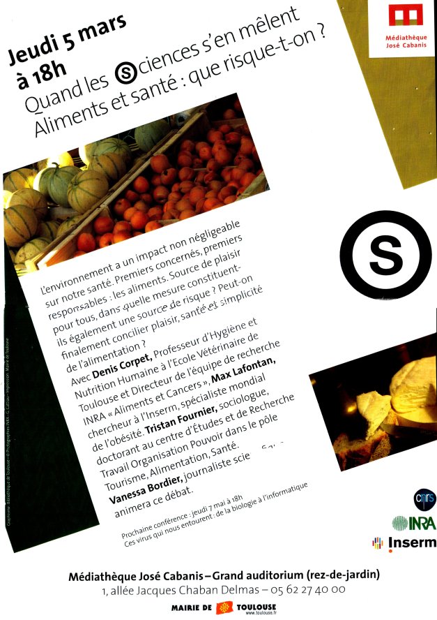 - 5 mars 2009, Médiathèque José Cabanis – Grand auditorium, Quand les Sciences s’en mêlent Aliments et santé : que risque-t-on ? (Quand les Sciences s’en mêlent 1 - cycle de conférences-débats avec INRA, INSERM & CNRS)