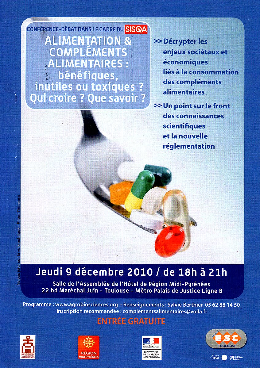 - 9 décembre 2010, conférence table-ronde grand public organisée par la mission des Agrobiosciences et l'ESC Toulouse : Compléments alimentaires : bénéfiques, inutiles ou toxique ? Conférence Table Ronde, grande salle du Conseil Régional Midi-Pyrénées, Toulouse, Vidéo en ligne sur Canal.U