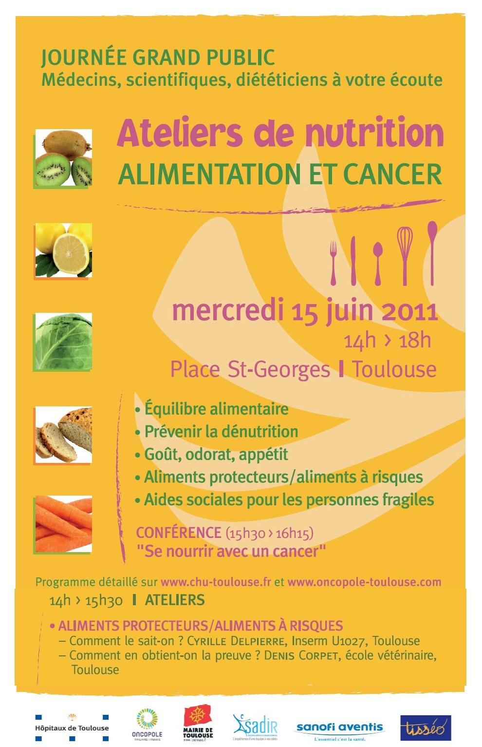 - 15 juin 2011, atelier de l’après-midi place St.Georges, 31000 Toulouse, dans le cadre de la journée nationale alimentation cancer, évènement organisé par Association Oncopôle de Toulouse et Patrick Ritz (PU-PH nutrition) : comment démontrer que certains aliments ont un effet sur le cancer ?
