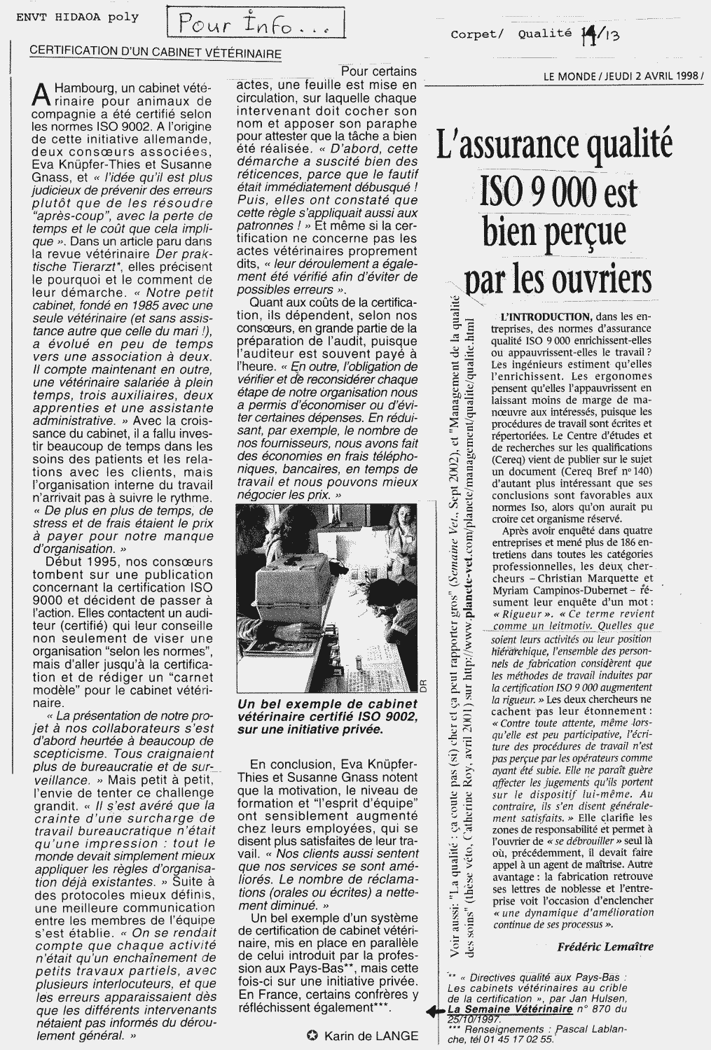 - A4 2014- Cours sur la Qualité des Aliments, Normes et Assurance Qualité (2014, 18 pages, 2.3 Mo en pdf. . Qualités hygiénique, nutritionnelle, organoleptique et d'usage. Les signes de la qualité, garanties de qualité (AOC, label rouge, agriculture biologique, IGP, STG). Maîtrise et assurance de la qualité. Normes ISO9000 et ISO 22000. IFS, BRC, GlobalGAP, et "qualité totale" = cycle de Deming + Annexe (article 1p sur vétos sous Iso 9000)
