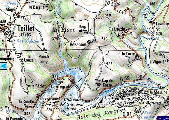V : voiture garée ; sommet champ : première balade ; lac : deuxième balade