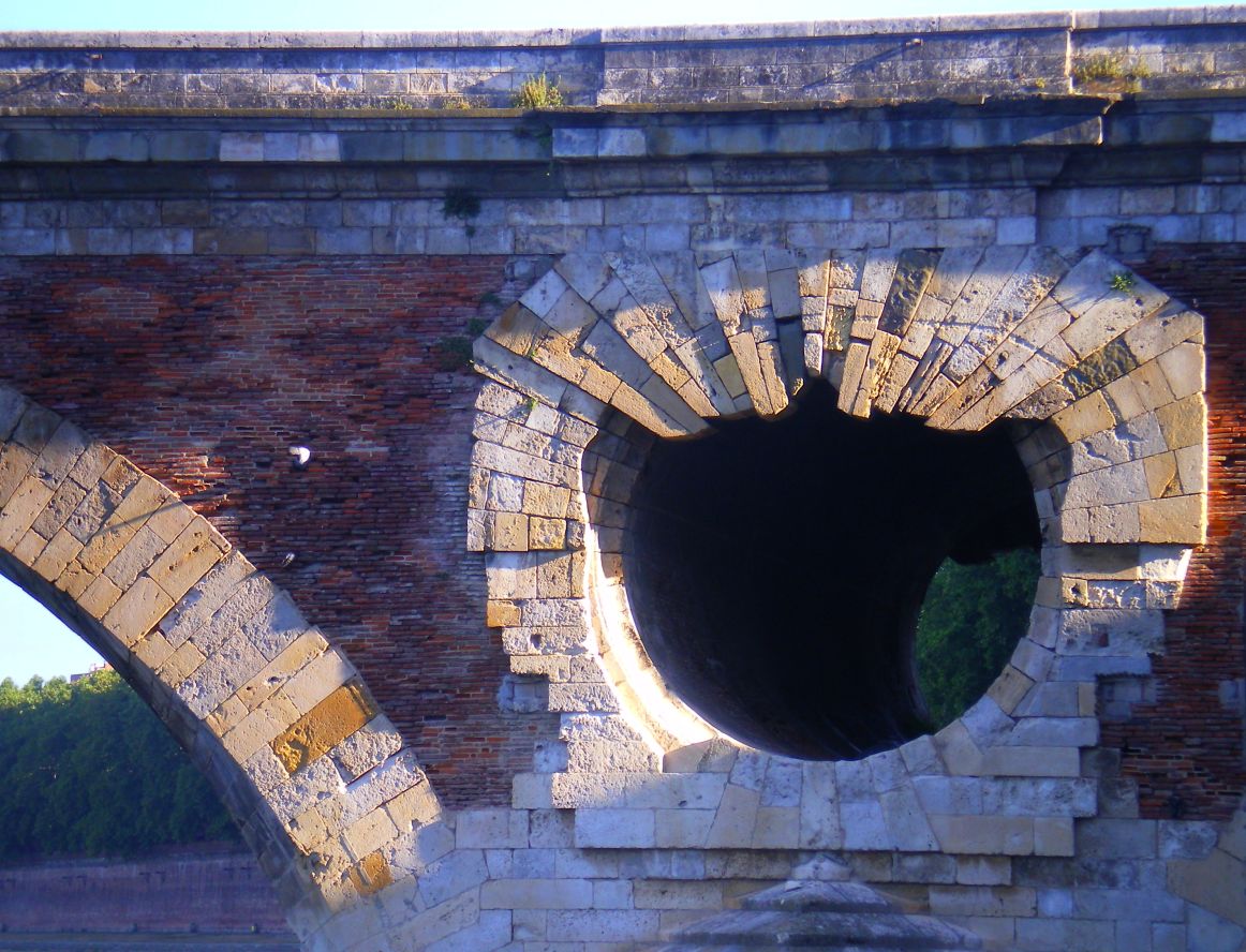 Le Pont Neuf prend des airs de grosses "lunettes" rondes (Google) avec ses "yeux". Et le soleil rasant du matin donne un relief étonnant aux gosses pierres dorées de ses "oculum" (destinés au départ à laisser mieux passer l'eau des crues printanières), tandis que les pigeons se régalent des joints entre les briques.