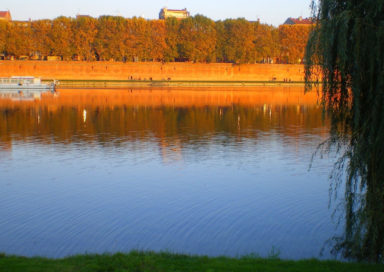 Toulouse au coucher du soleil, la brique rose qui vibre et qui chante. Le quai de Tounis, la promenade Henri Martin se reflètent sur la Garonne, émaillée des reflets d'or des fenêtres de Claude Nougaro.