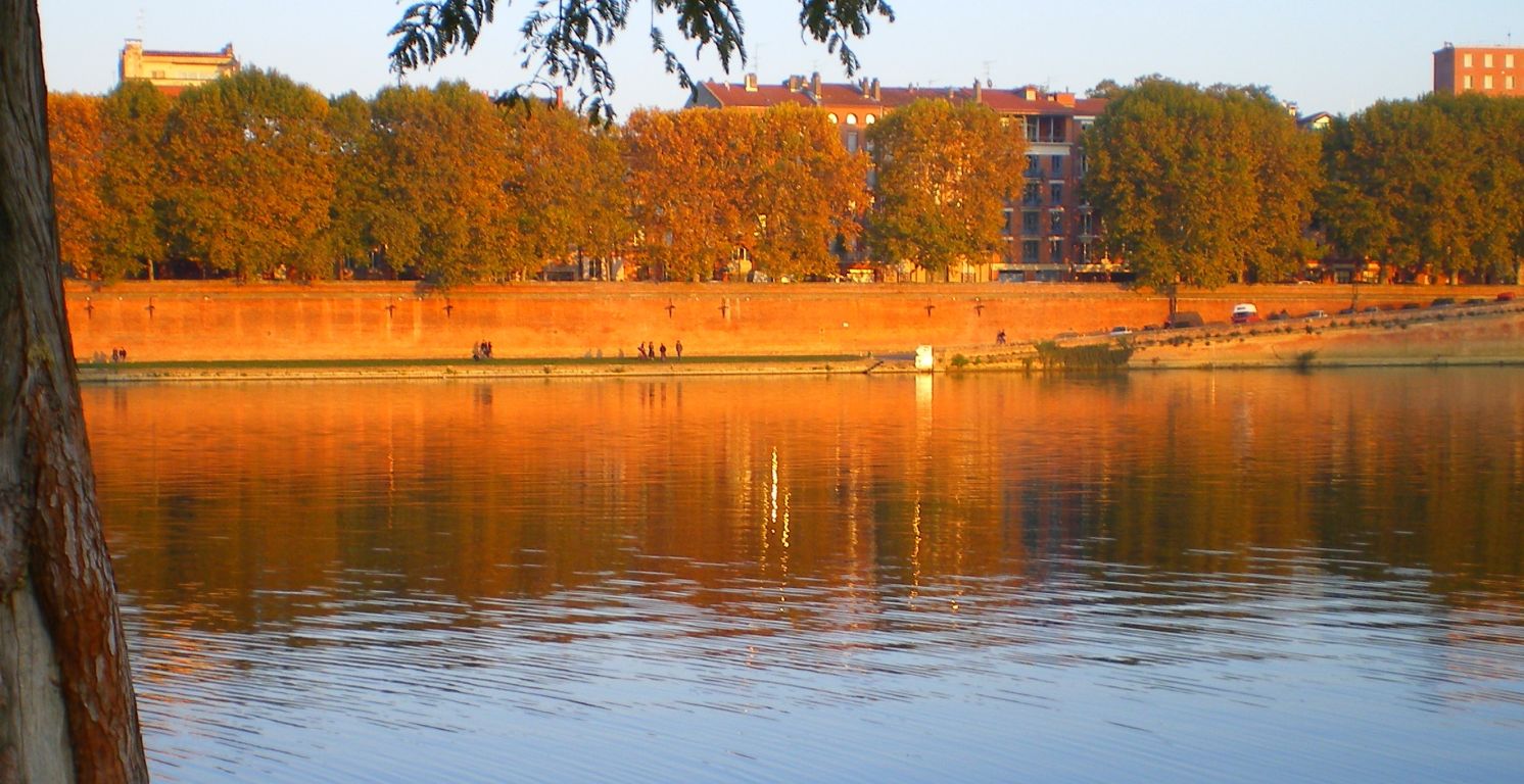 Toulouse au coucher du soleil, la brique rose qui vibre et qui chante. Le quai de Tounis, la promenade Henri Martin se reflètent sur la Garonne, émaillée des reflets d'or des fenêtres de Claude Nougaro.