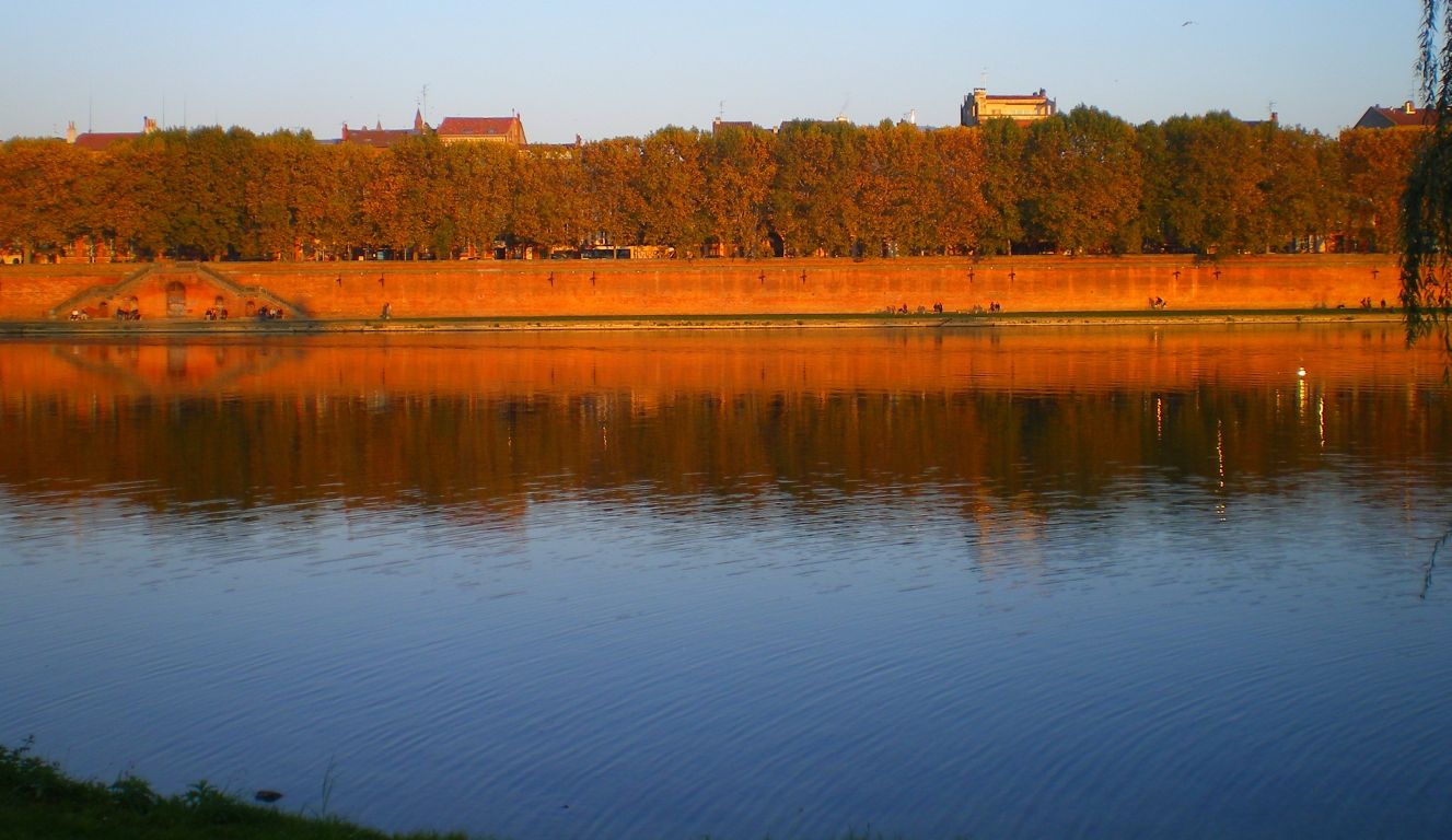 Toulouse au coucher du soleil, la brique rose qui vibre et qui chante. Le quai de Tounis, la promenade Henri Martin se reflètent sur la Garonne, émaillée des reflets d'or des fenêtres de Claude Nougaro.