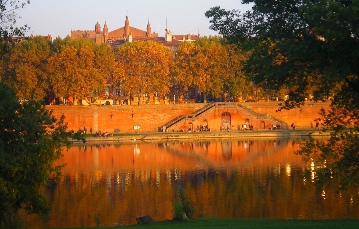 Toulouse au coucher du soleil, la brique rose qui vibre et qui chante. Le quai de Tounis, la promenade Henri Martin se reflètent sur la Garonne, émaillée des reflets d'or des fenêtres de Claude Nougaro.