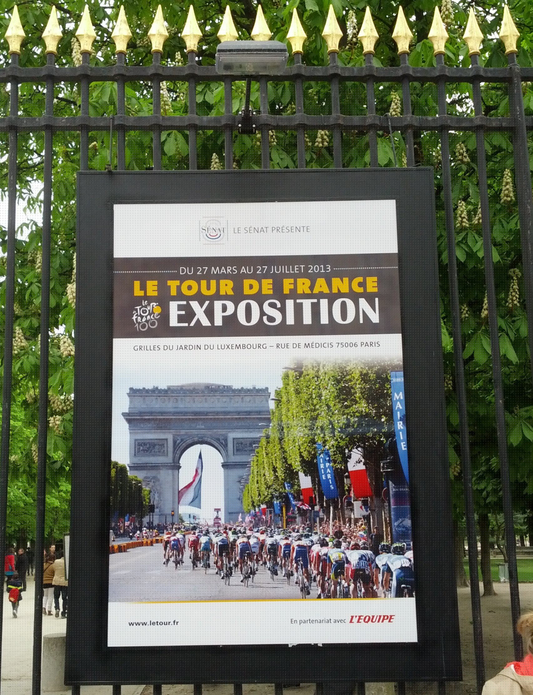Des supporters de Louison Bobet, futur vainqueur de ce Tour, dans la 14ème étape entre Bézier et Nîmes. Exposition de photos sur le Tour de France, sur les grilles du jardin du Luxembourg à Paris, organisée en 2013 par le Sénat / Posters exhibition on Luxembourg park gates