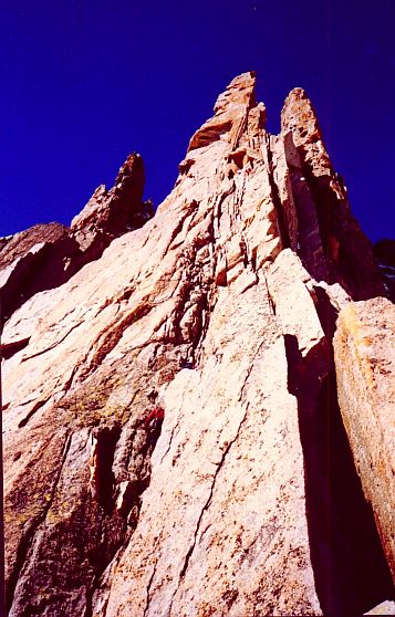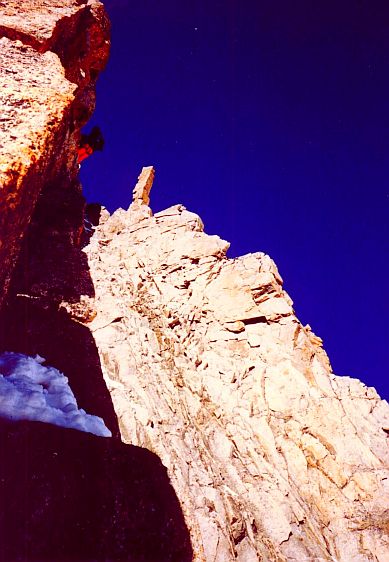 Attention, après l'escalade, quand on est en haut "du pilier", ce n'est pas fini, loin de là. Nous avons tiré à gauche, grimpant dans du "facile", mais on reste tout de même encordés (corde tendue) pour pas mal de longueurs. On continue à grimper, même si il n'y a plus de clous! A la fin on revient vers la droite, pour prendre l'arête de neige du sommet