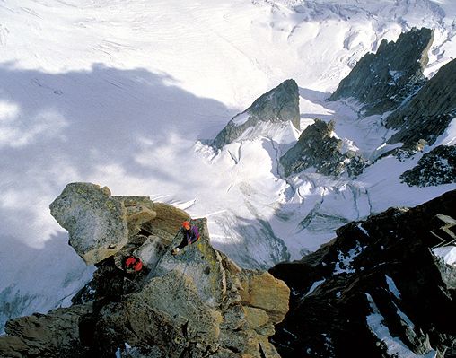 Photo 2: Surplomb (voir mec rouge), & glace pas agréable dans le passage face Nord, sous un gendarme narquois
