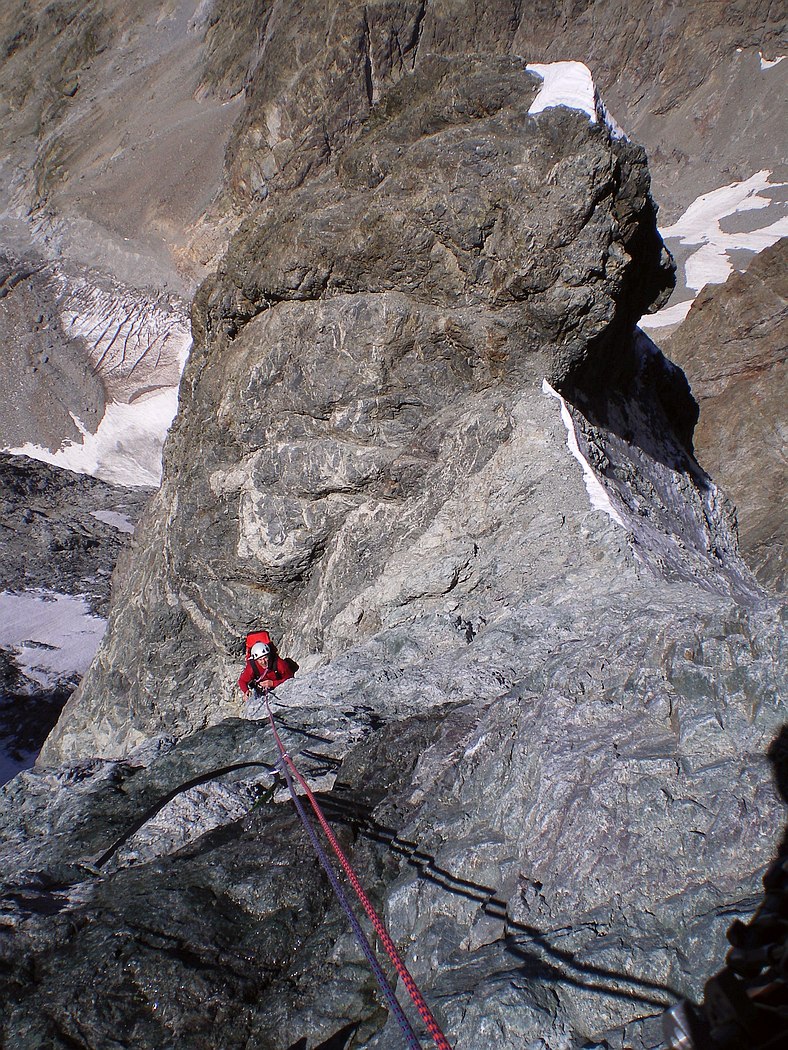 Noël Dupré la Tour dans la première longueur des Dalles Grises Admirez derrière lui ce "nez" que fait la fin de l'éperon central taille photo width="788" x height="1050" | >> ➜ |