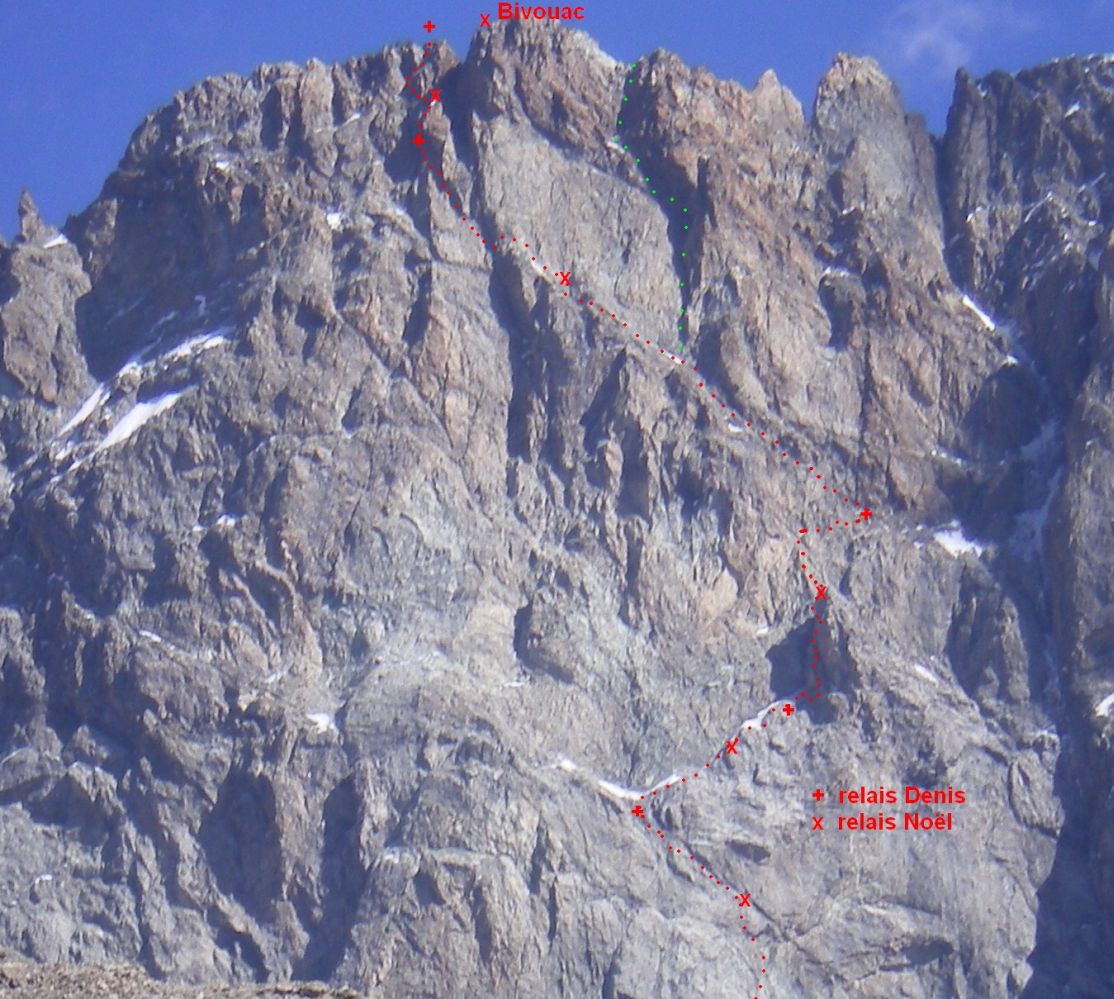 Ailefroide face NW: topo des dalles à la sortie Dalles grises, vire arc-de-cercle, 2 cheminées, grande traversée, dièdre et laminoirs de sortie | 40-vire-arc-de-cercle-15h.html ➜ |