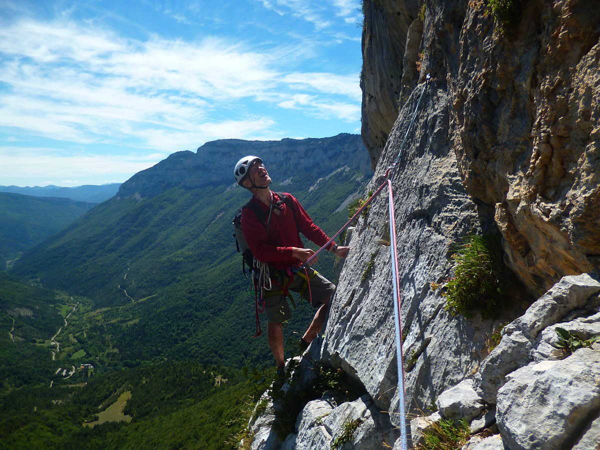 La voie du Levant : Grande classique du Diois, sur la droite du "chateau" dans le cirque d'Archiane au sud du Vercors. Une très belle voie "old school", équipée à l'ancienne, et pas trop dure. Noël Dupré la Tour et Denis Corpet le 20 Août 2015.