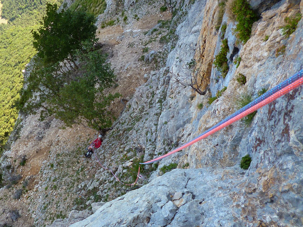 La voie du Levant : Grande classique du Diois, sur la droite du "chateau" dans le cirque d'Archiane au sud du Vercors. Une très belle voie "old school", équipée à l'ancienne, et pas trop dure. Noël Dupré la Tour et Denis Corpet le 20 Août 2015.