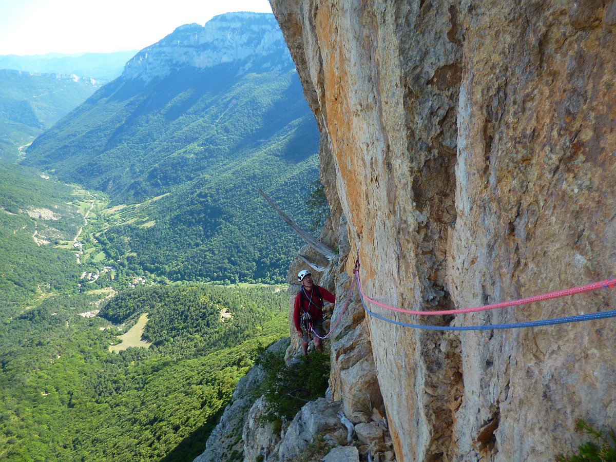 La voie du Levant : Grande classique du Diois, sur la droite du "chateau" dans le cirque d'Archiane au sud du Vercors. Une très belle voie "old school", équipée à l'ancienne, et pas trop dure. Noël Dupré la Tour et Denis Corpet le 20 Août 2015.