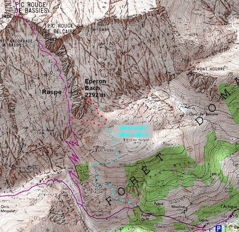 Carte 25M, l'Artigue, pic rouge de Bassiès, Belcaire, éperon Bach
