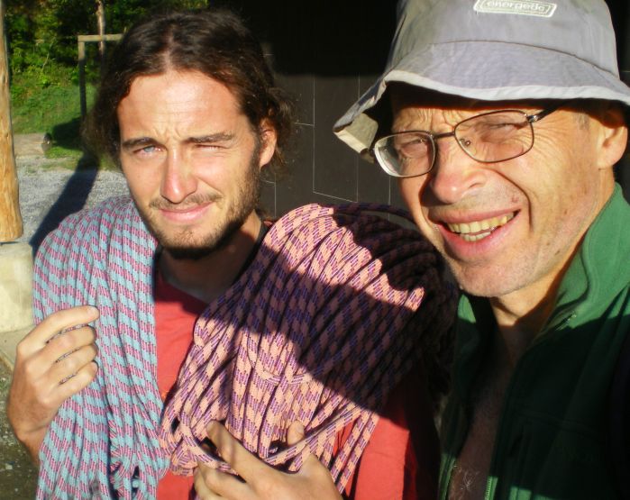Denis Corpet et Cédric CLZR grimpent la voie "Aco es Poulit" sur l'éperon Bach du pic de Belcaire, 23 Août 2009