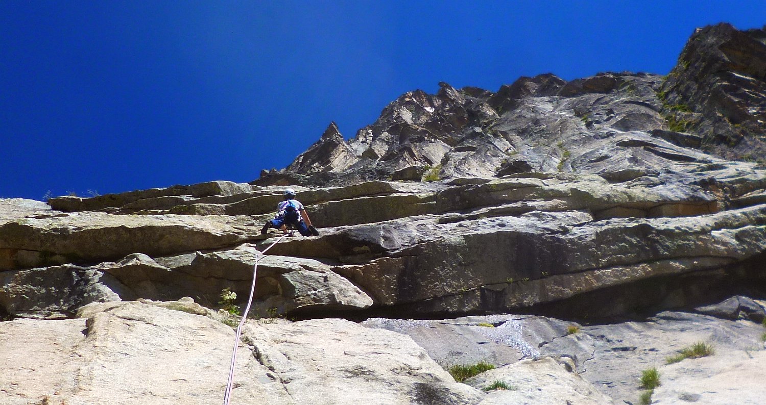 Superbe granite de haute montagne, exposé au Sud-Sud-Ouest, voie semi-équipée: