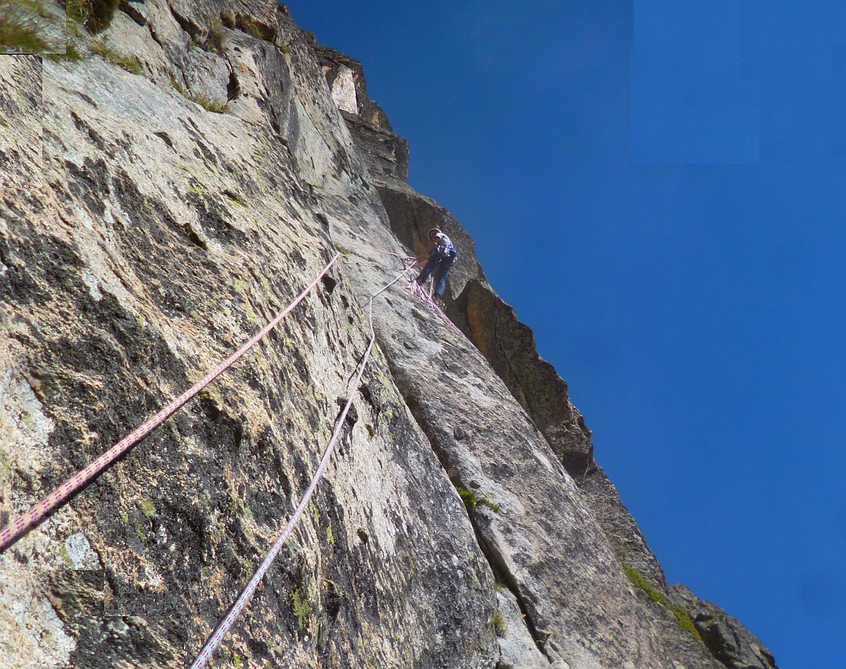 Superbe granite de haute montagne, exposé au Sud-Sud-Ouest, voie semi-équipée:
