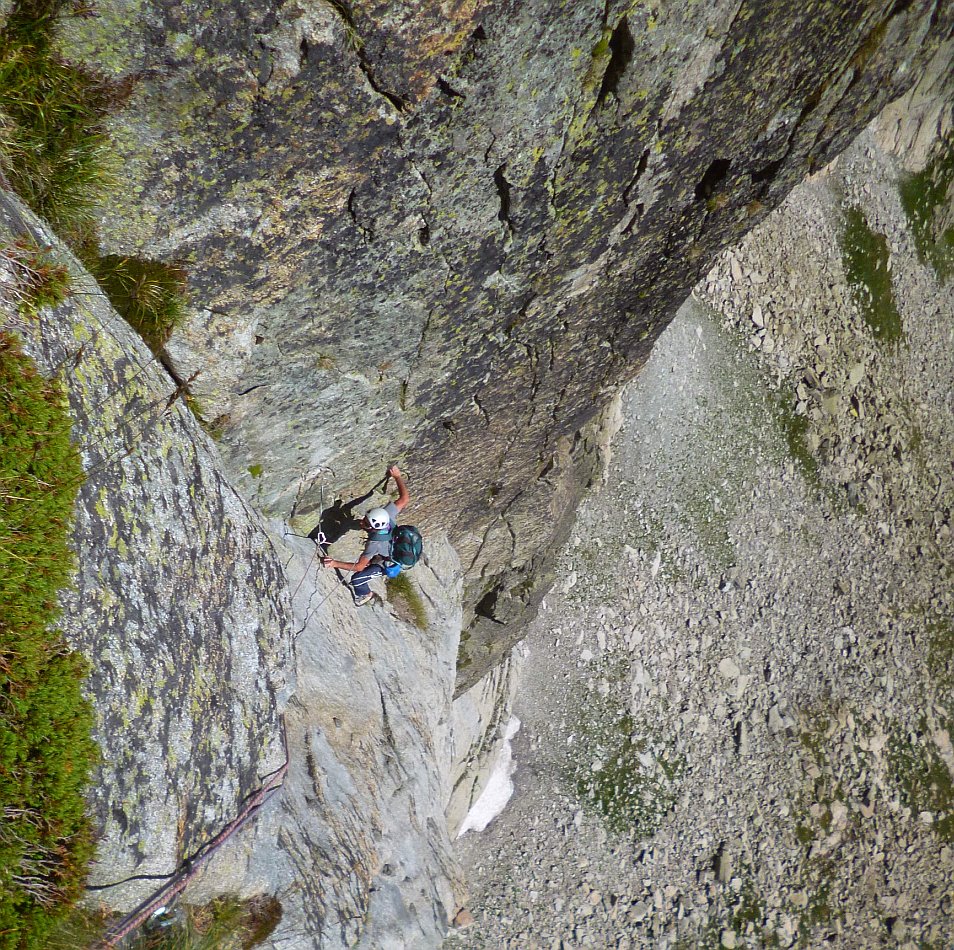 Superbe granite de haute montagne, exposé au Sud-Sud-Ouest, voie semi-équipée: