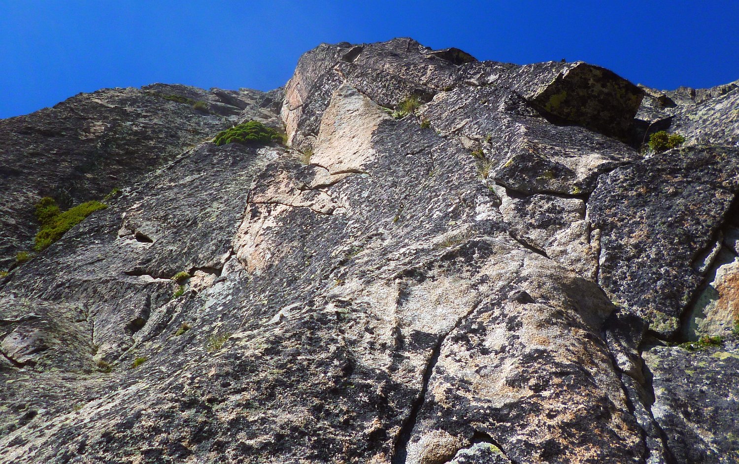 Superbe granite de haute montagne, exposé au Sud-Sud-Ouest, voie semi-équipée: