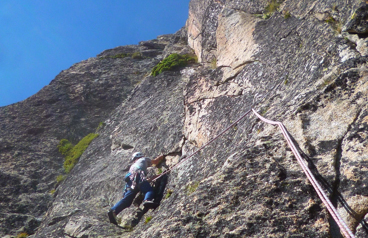Superbe granite de haute montagne, exposé au Sud-Sud-Ouest, voie semi-équipée: