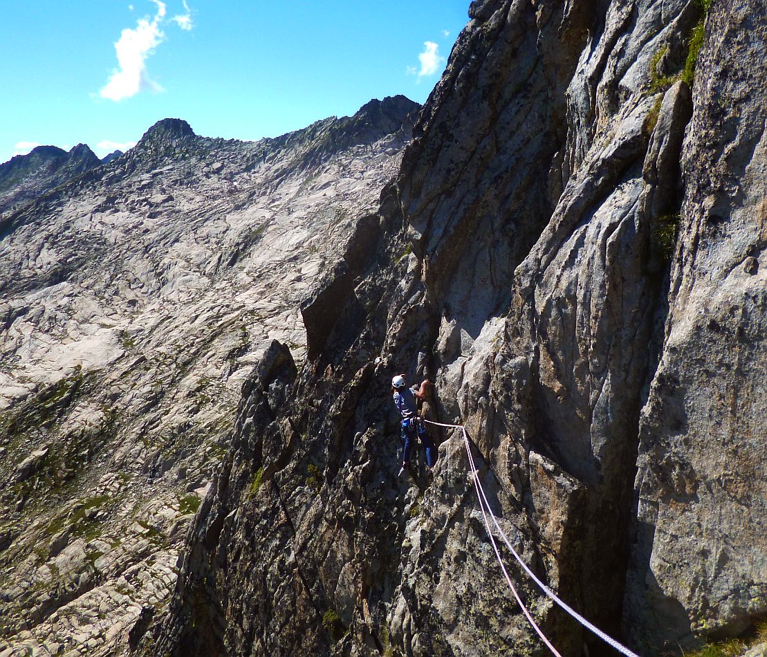 Superbe granite de haute montagne, exposé au Sud-Sud-Ouest, voie semi-équipée: