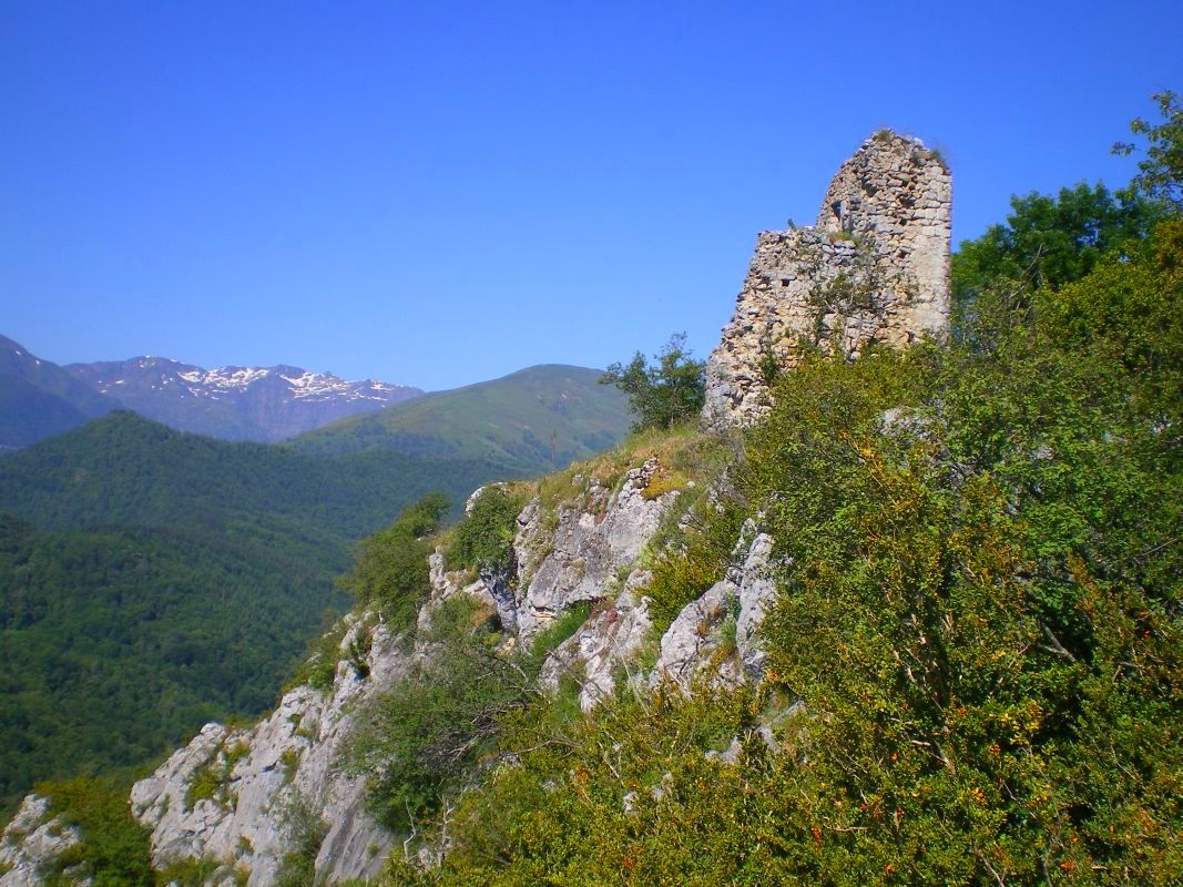 Bon rocher calcaire, escalade falaise agréable mais très CHAUDE. Chateau cathare au sommet (ruine), Pyrénées enneigées