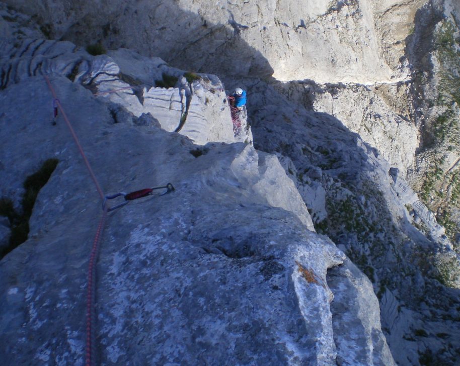 Belle voie de belle ambiance, avec un vrai passage d'artif, au soleil et sur un calcaire correct. Equipement correct (clous et spits). Descente par une raide pente d'herbe puis un bon sentier