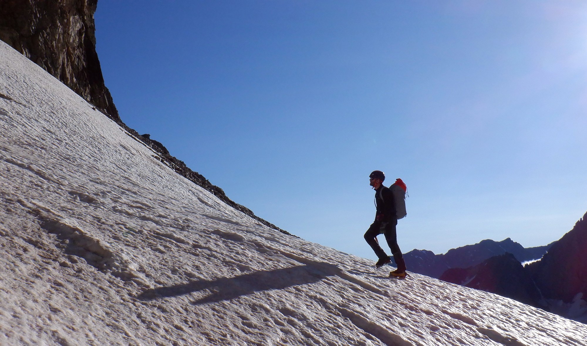 Grande voie: glacier, bon rocher facile, neige d'altitude: un beau sommet des Alpes