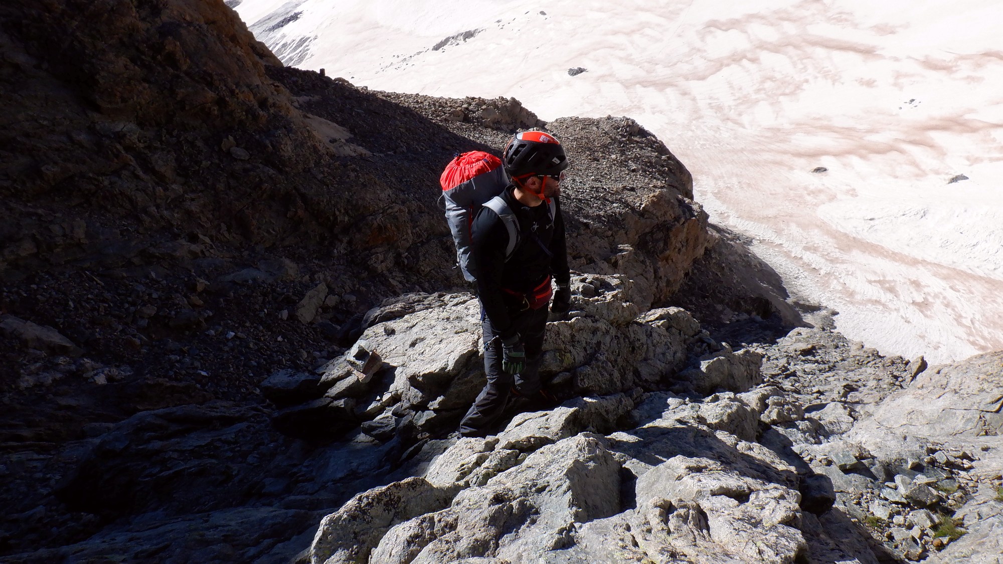 Grande voie: glacier, bon rocher facile, neige d'altitude: un beau sommet des Alpes