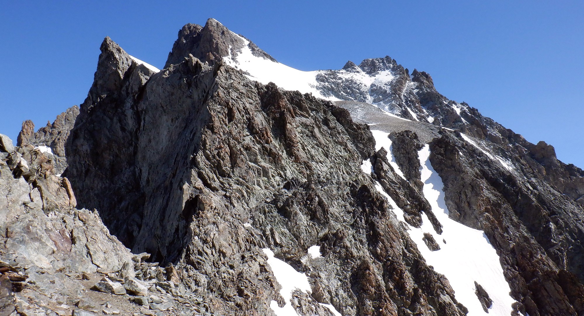 Grande voie: glacier, bon rocher facile, neige d'altitude: un beau sommet des Alpes