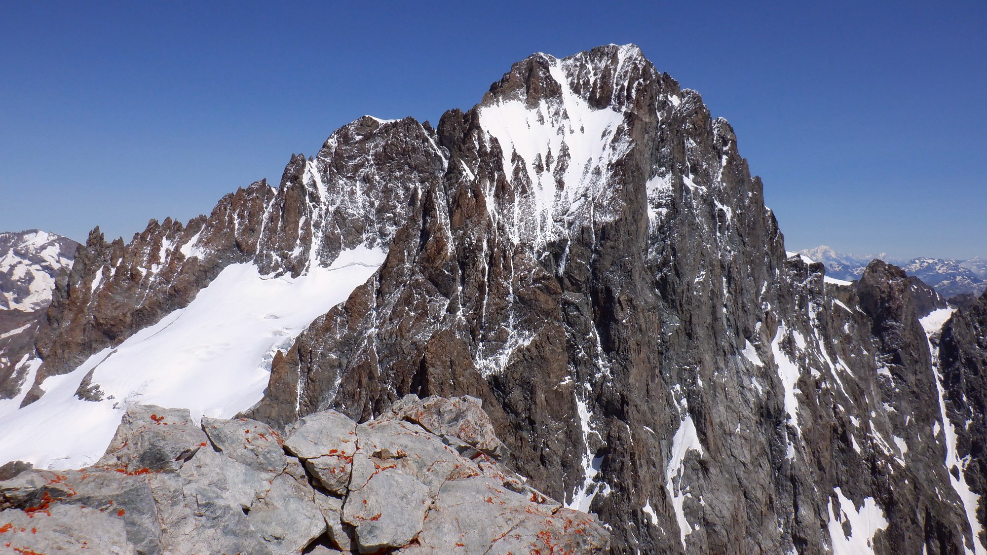 Grande voie: glacier, bon rocher facile, neige d'altitude: un beau sommet des Alpes