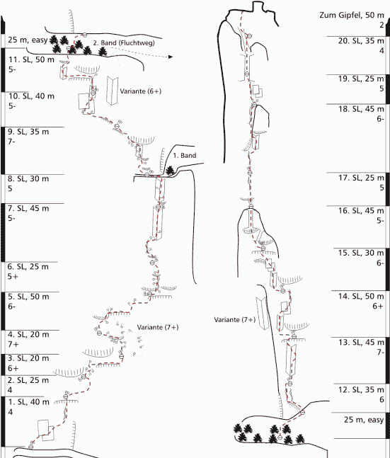 On se trouve alors à la deuxième grande vire couverte de pins mugo courbés, d'où il est très simple de sortir de la voie en traversant à droite (nord) pour rejoindre la voie de descente. Un sentier monte jusqu'à la paroi Est sommitale, superbe de raideur de de beau calcaire. La voie va louvoyer dans cette dalle, quelques mêtres à droite du spigolo SE