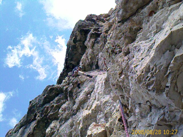 Super voie sur la Torre di Torri / Tower of Towers, escalade de Noël Dupré la Tour et Denis Corpet, jeudi 28 Août 2008. J'avais jamais mis les pieds dans les Dolomites ! Lundi on avait tâté la dolomie à la voie Tissi / Torre Venezia (450m, VI-), puis mardi la voie Solda / Torre di Babele (300m, VI-).