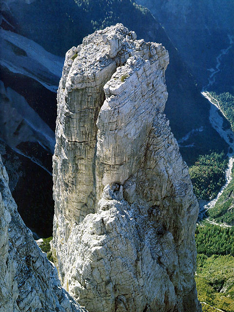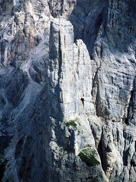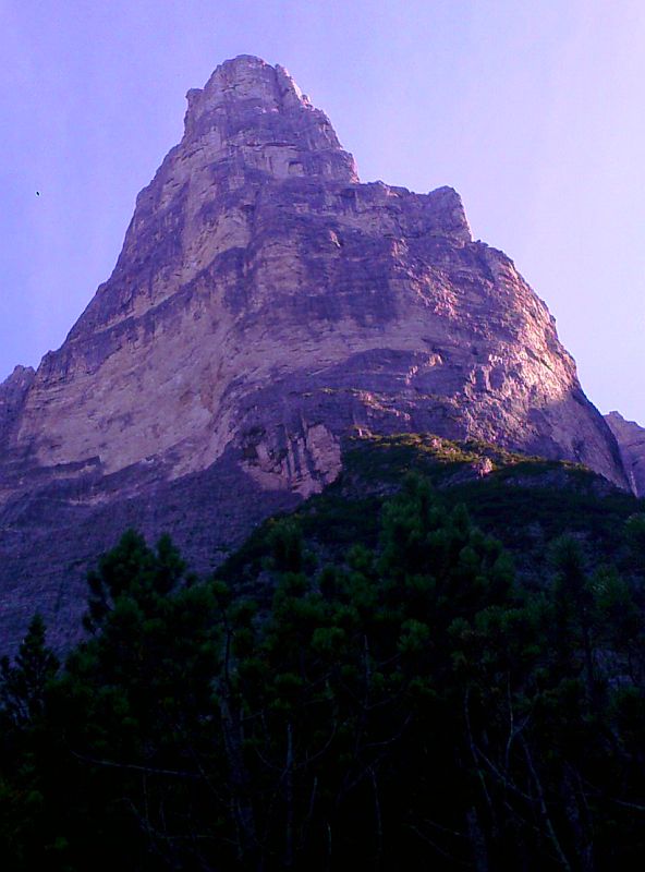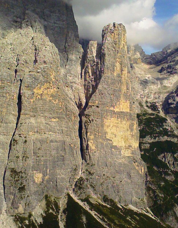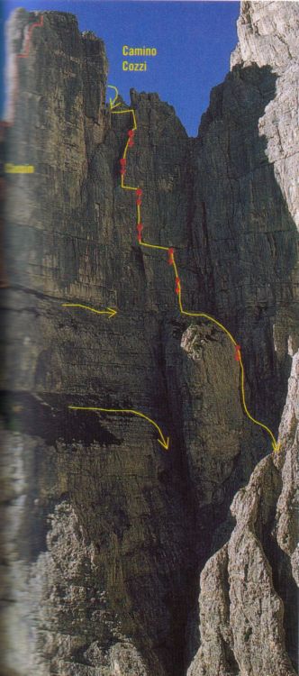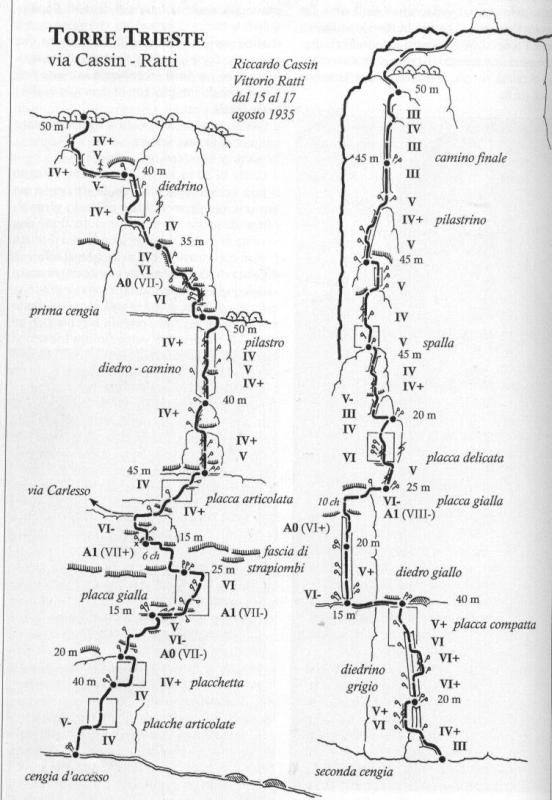 Torre Trieste, 2458 m, face Sud-Est, via Cassin (texte et photos tirés de la revue "Vertical"la plus belle ascension du massif, par ses difficultés et par son rocher exceptionnel dans la partie haute. La voie est interrompue par les deux vires qui permettent de sortir de la paroi facilement en cas de problème. Cette caractéristique, conjuguée à une exposition favorable, à un bon pitonnage et à une approche relativement aisée, en fait une voie très attrayante. Very beautiful route, best Dolomite ever on top part, lower part demands good route finding skills