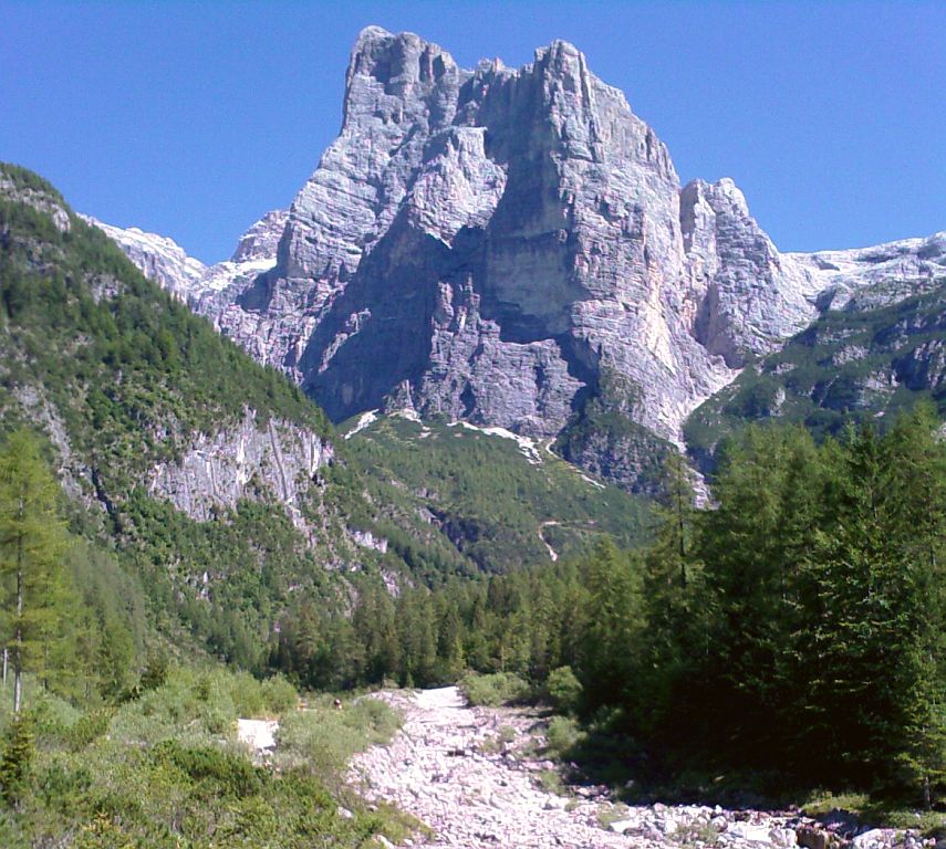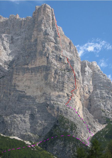 Accès: Du refuge Vazzoler descendre 10 min sur la route, traverser le grand torrent, et prendre à gauche le bon sentier vers la via ferrata (panneau). D'abord plat, il monte un peu (forêt bosse) et redescend vers le lit d'un gros torrent sec. Juste avant le torrent prendre un vague sentier vers la gauche (quelques pas de I), qui 100m plus haut traverse vers la droite le lit du torrent, le suit un peu (cairns), puis zig-zague raide en rive gauche (à droite en montant). Au niveau d'énormes blocs (bivouac dessous) retraverser le torrent vers la gauche pour prendre pied par quelques pas d'escalade facile (pierres) sur une vire ascendante de droite à gauche sur la Torre Trieste (une "faja") . Suivre facilement cette vire aérienne (bivouacs) jusqu'au pied de la face Sud. Deux pitons indiquent le départ de la voie, dans une dalle facile.