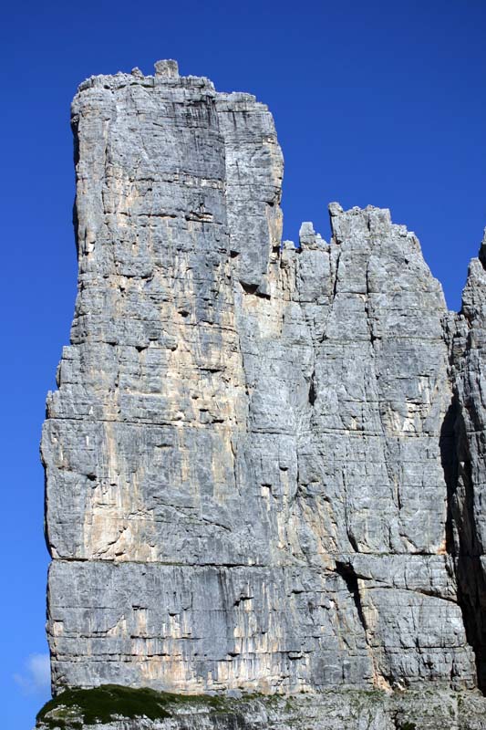 L'itinéraire Cassin traverse par la vire à gauche en contournant le spigolo pour arriver à la base d'un évident dièdre jaune-gris. 13a- Voie Cassin originale: Gravir tout le dièdre. Passé un mur jaune pauvre en prises, continuer à droite jusqu'au relais (50 m, V+ et VI, un passage de Vll+ =6c ou VI-AO).