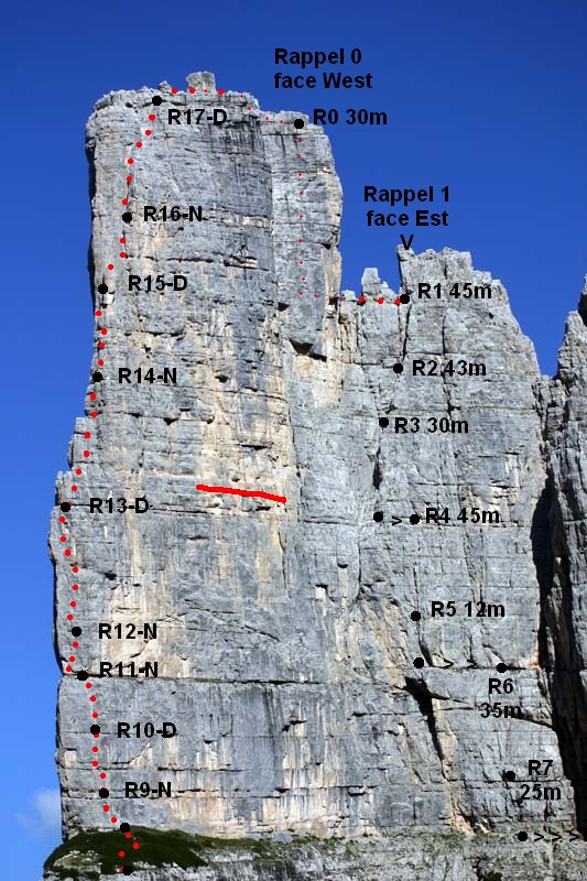 Du sommet, se diriger vers l'ouest jusqu'à la brèche de la fissure sommitale, encombrée de gros blocs, oú démarrent des rappels versant Est (anneau inox).