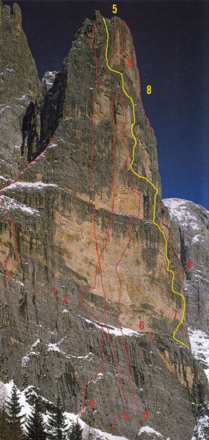 1 Arête ouest: Giovanni Andrich, Attilio Tissi, Domenico Rudatis, 1931, 600 m, TD, 5c. Par l'arête intégrale: Jean Coury et Marcel Schatz, 1948. Classique d'ampleur mais de difficulté modérée. Une trés belle façon de faire la Trieste.