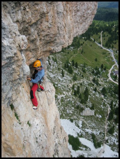 Prévoir deux cordes d'au moins 45 mètres. II s'agit de l'une des descentes les plus laborieuses des Dolomites. Compter 3 à 5 heures. Nombreux emplacement de bivouac tout du long. Tous les rappels étaient équipés en 2008, avec au moins deux bon pitons, des cordelettes correctes et des maillons ou mouskifs