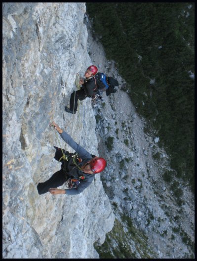 10b- pas fait: Tout droit, puis à gauche, et passer un dièdre pourri pour atteindre la deuxième vire (35 m, IV et IV+).