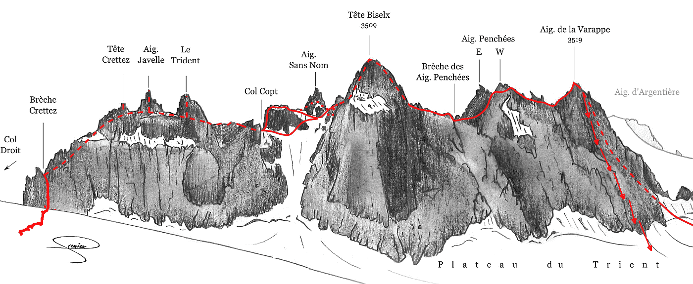 Topo schéma: Traversée des aiguilles DoréesDessin de Lazare Grenier, licence: Creative Commons CC-by-sa Source: http://www.camptocamp.org/images/259235/fr/aiguilles-dorees-itineraires-du-versant-n |