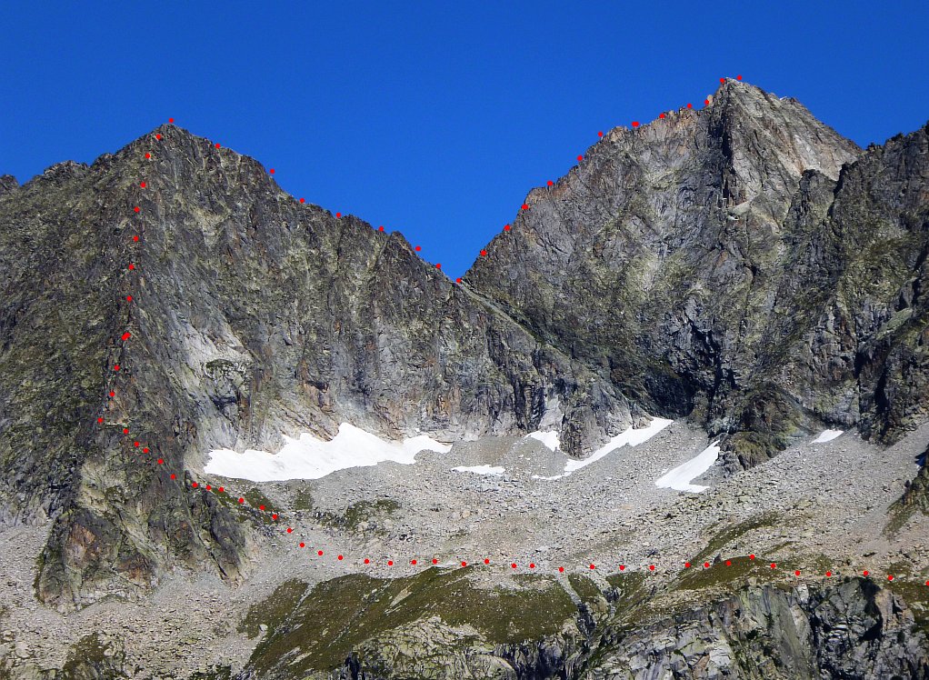 - Dans l'escalade de la Ferbos, ça passe partout. J'ai suivi le fil de l'arête, en restant dans le 3+ toujours sur du très bon granite. En 2011 j'avais fait quelques variantes amusantes, style surplomb d'énormes prises en 4+ (facultatif). Vers la gauche on tombe vite sur des "sentiers" dangereux sans intérêt.