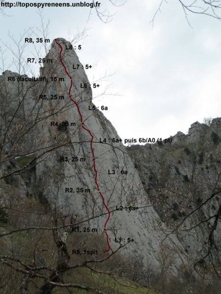 Huit longueurs d'escalade pour 210m (?), beaucoup de 6a obligatoire + 1 pas de 6b ou A0