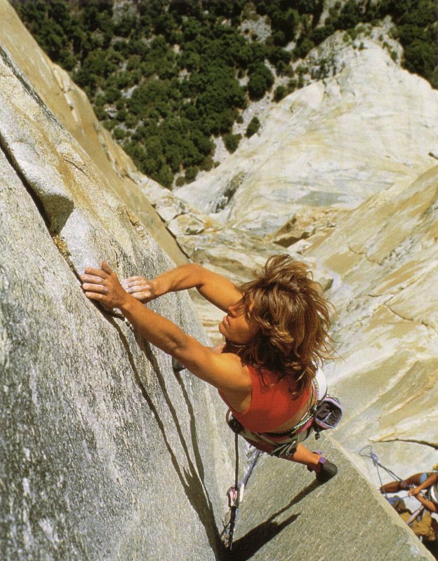 Lynn Hill, vient de finir le mouvement tournant de Changing Corner, El Capitan, Nose, Yosemite Fallait oser, mais c'est réussi ! (tiré du livre carré rouge chez Guérin Climbing Beauty - All Pretty Climbers