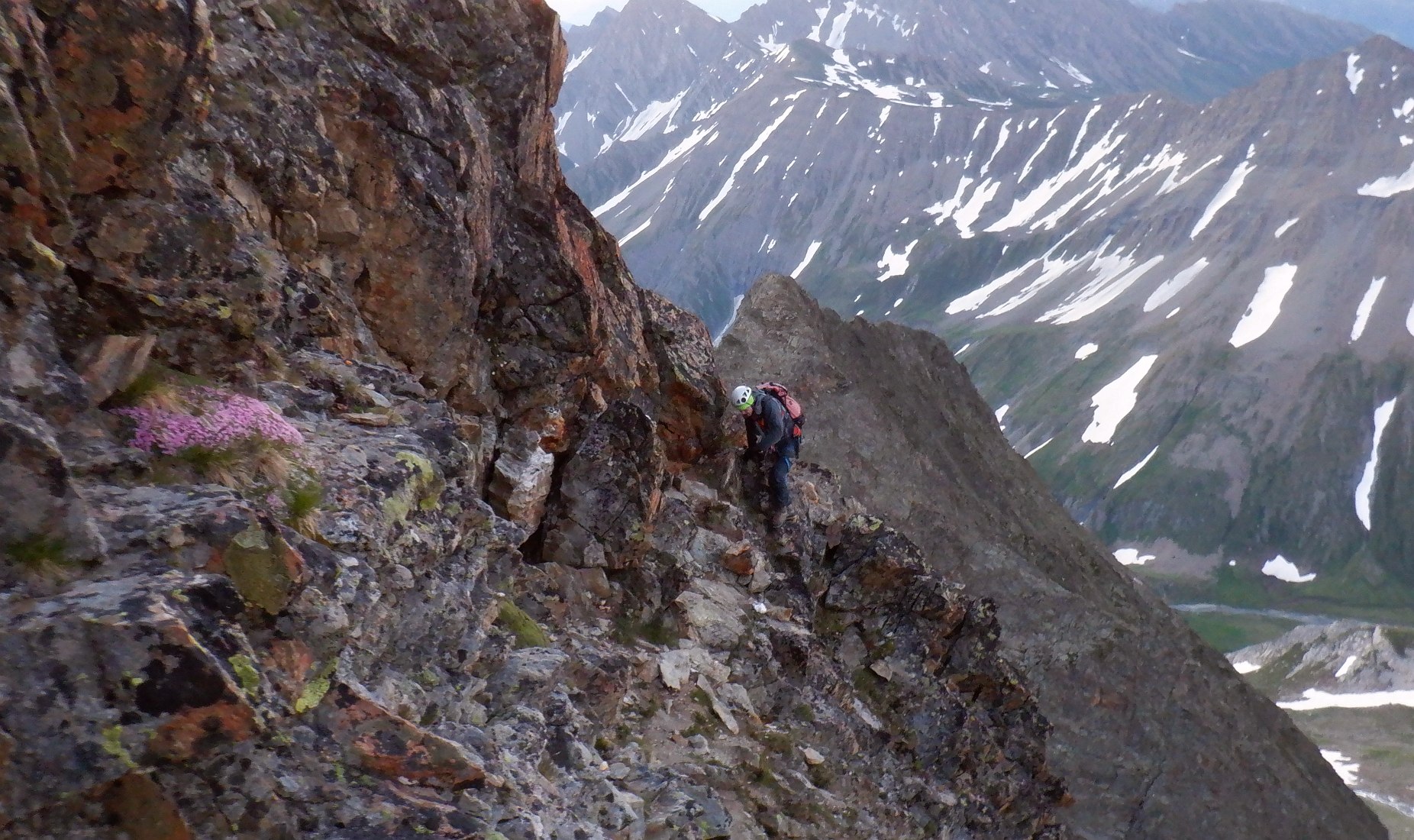 Belle escalade facile, granite rouge + neige, Arète Kuffner