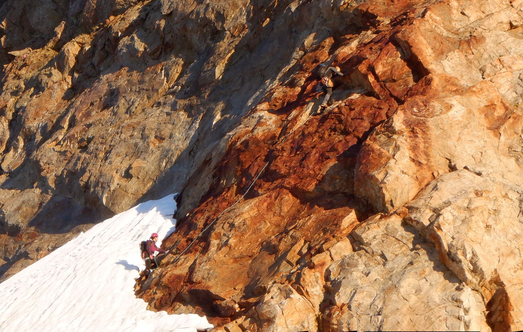 Belle escalade facile, granite rouge + neige, Arète Kuffner