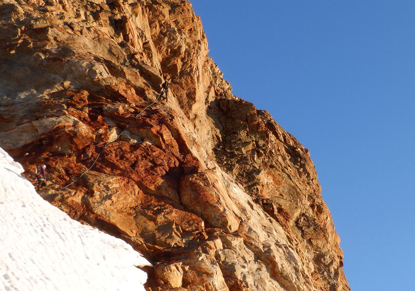 Belle escalade facile, granite rouge + neige, Arète Kuffner